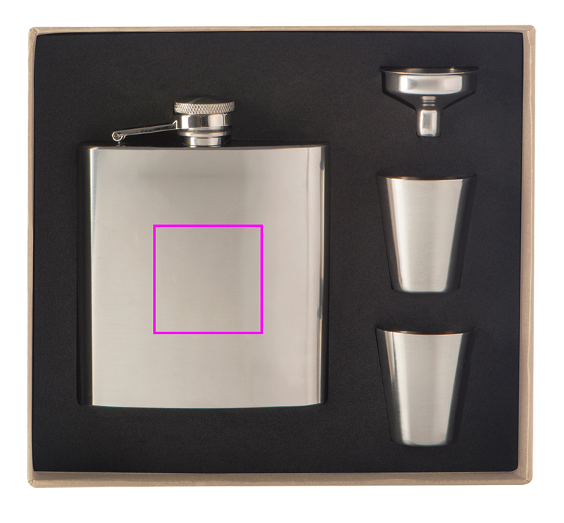 Vackert set bestående av en höftkolv (kapacitet 170 ml), två shot-koppar och en tratt, gjord av rostfritt stål. Din logotyp kommer att laseras på höftkolven.