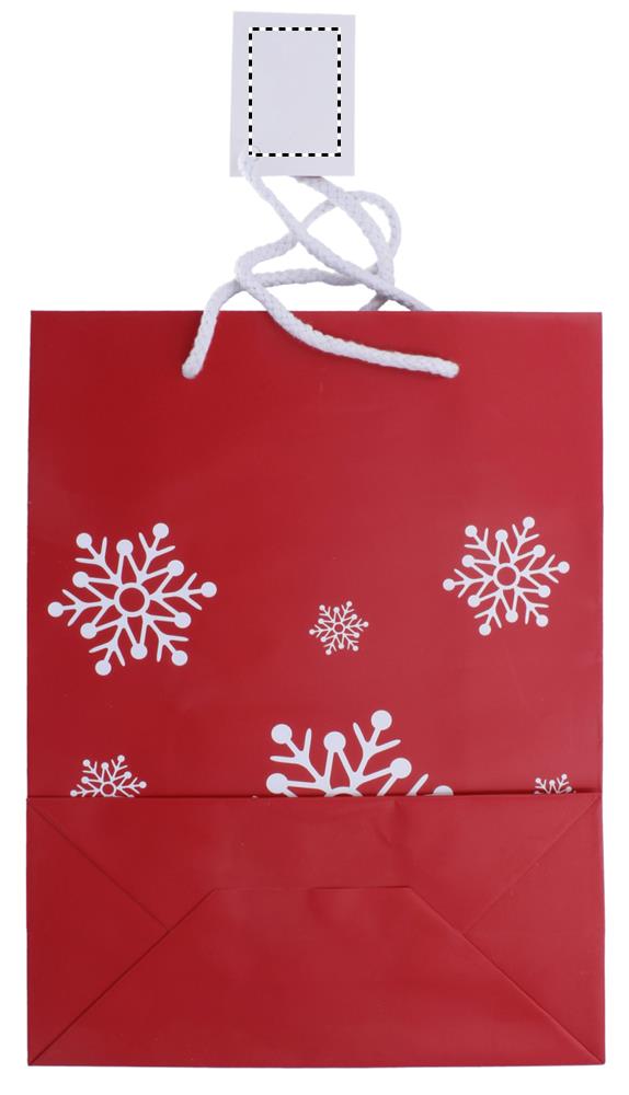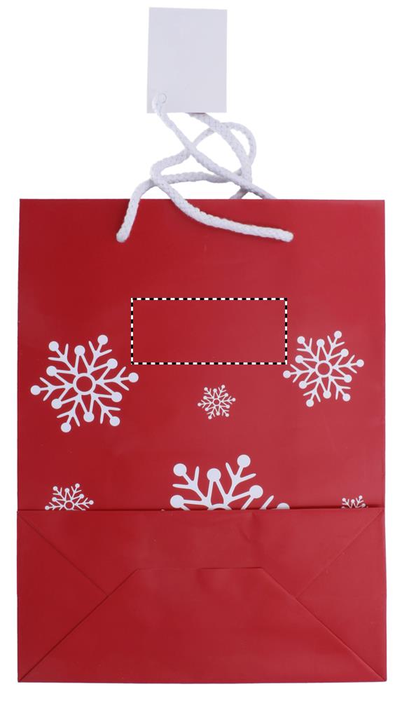Elegant papperspåse med snöflingor mönster. Presenthälsningskort på handtaget. 30 cm hög.