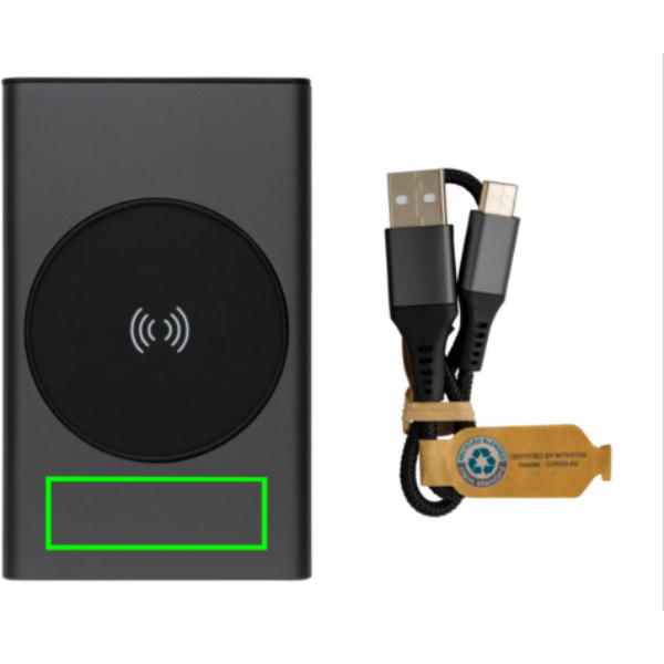Powerbank tillverkad av RCS (Recycled Claim Standard) certifierad återvunnen aluminium och ABS. Totalt återvunnet innehåll: 31% baserat på total produktvikt. RCS certifiering säkerställer en helt certifierad leveranskedja av de återvunna materialen. Aluminium förlorar inte sina egenskaper i återvinningsprocessen och kan återvinnas i det oändliga. Powerbanken har ett långvarigt A-graderat 5.000 mAh lithium polymer batteri. Den trådlösa laddningen stödjer trådlös laddning upp till 5W. Strömindikatorn visar energinivån så att du vet när det är dags att ladda på nytt. Produkt och accessoarer är 100% PVC-fria. Type C laddningskabel i RCS certifierad återvunnen aluminium, TPE och PET medföljer. Levereras i FSC® mix förpackning. USB output 5/2.4A, Type C output: 5V/2.4A. Type C input: 2.4A. Micro USB input: 5V/2A.