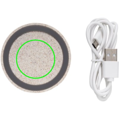 Trådlös laddare i vetefiber (15%) blandat med ABS för laddning av alla trådlösa enheter. Med silikonring som håller telefonen på plats. LED-lampan indikerar att enheten laddar. Kompatibel med alla QI-aktiverade enheter som senaste generationen Android, iPhone 8 och upp. Input: 5V/1.5A. trådlös Output: 5V/1A, 5W. 50cm PVC-fri micro USB kabel i TPE medföljer.